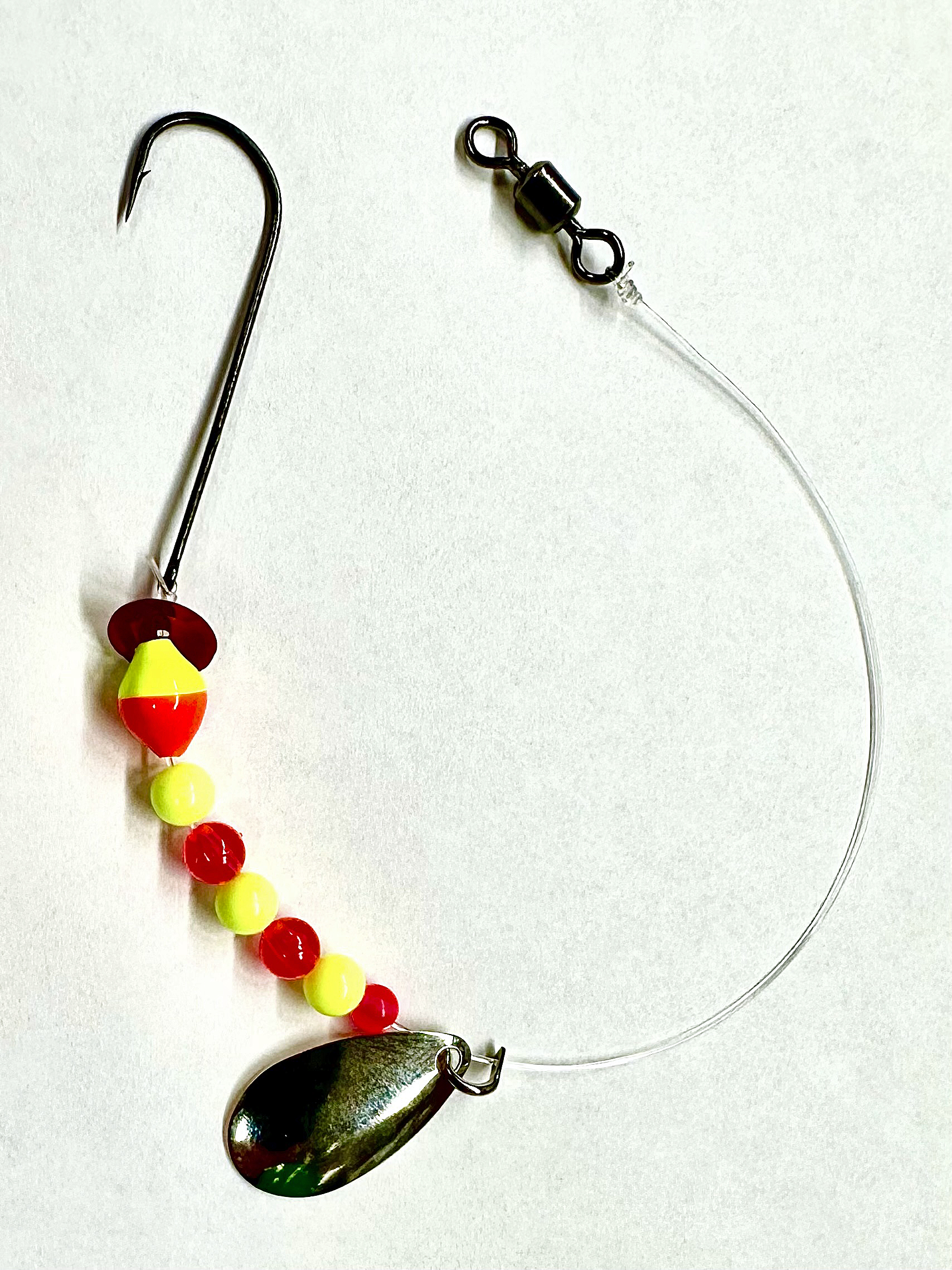 Kalles Angelshop-Naturköder Mundschnur-Perle Lil’ Corky® Flame Chartreusw (FLCH) Gr. 14  Spinnerblatt Tropfen Gr,2 Länge 22 mm Ssilber