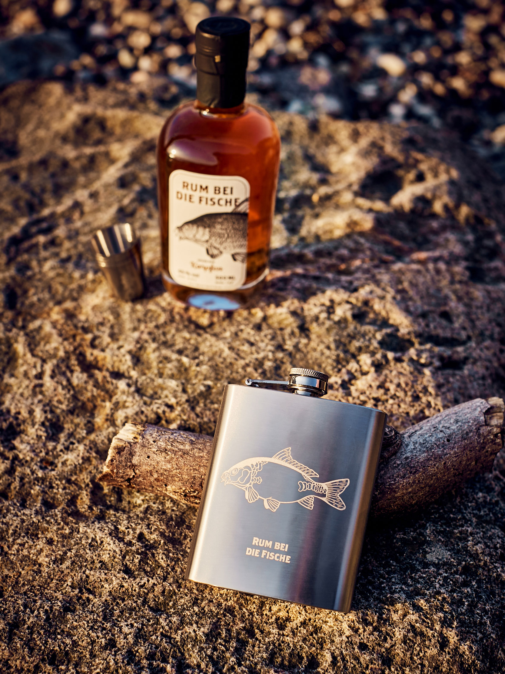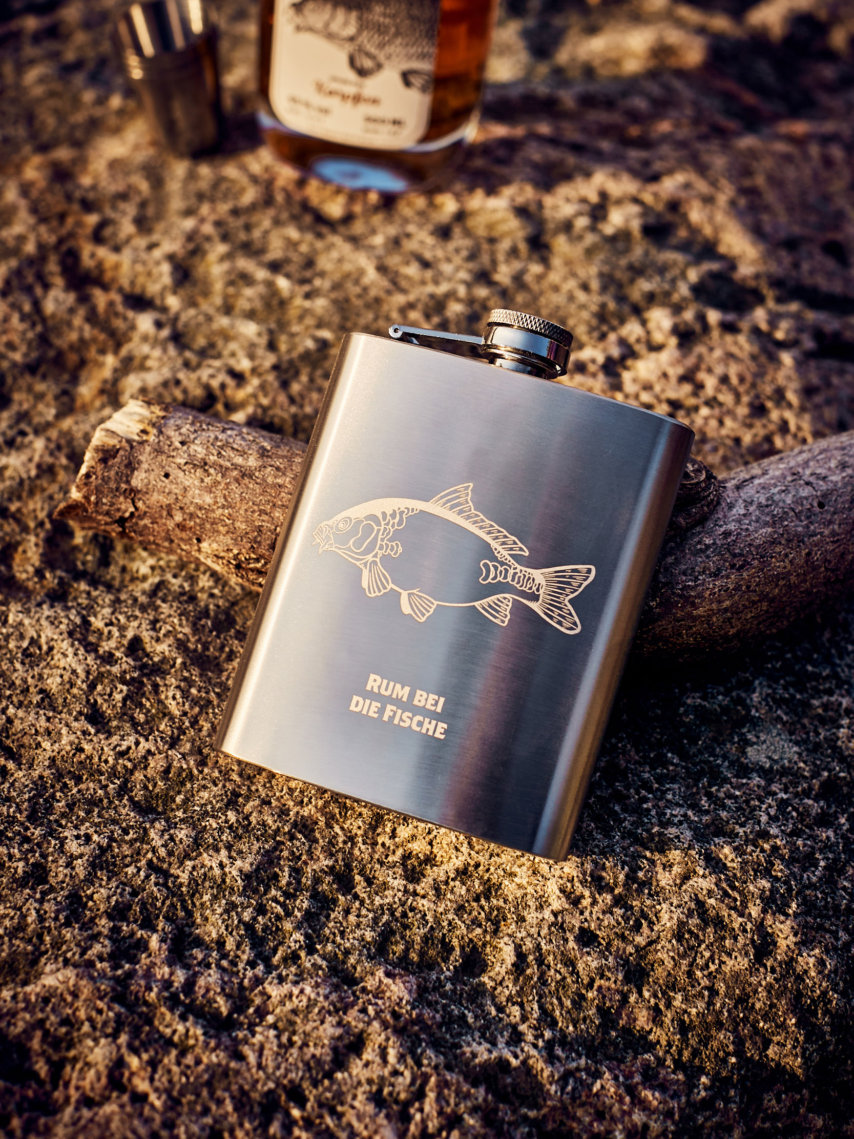 Flachmann hochwertiger Gravur eines Karpfen und kleinem „Rum bei die Fische“ Schriftzug.