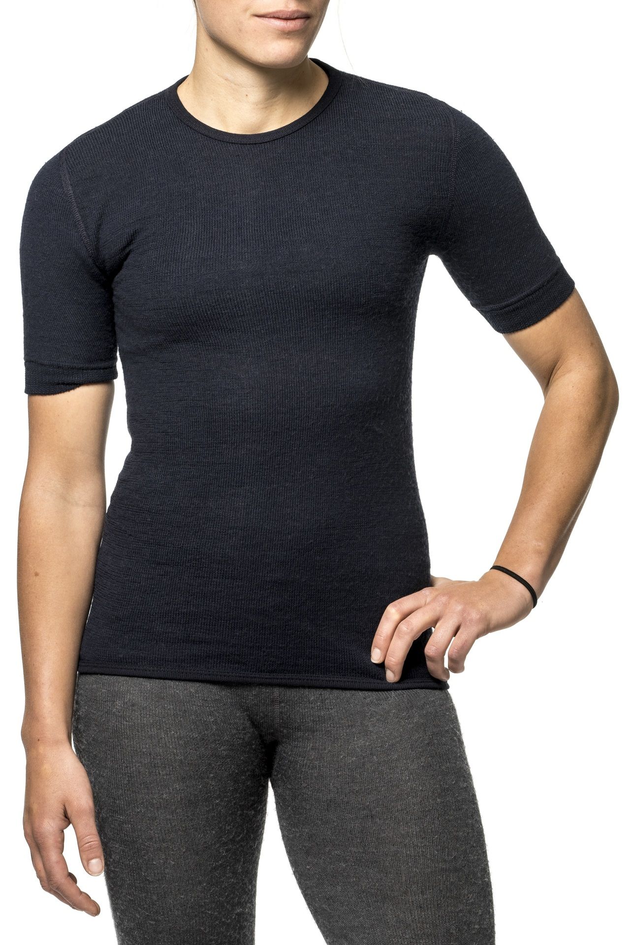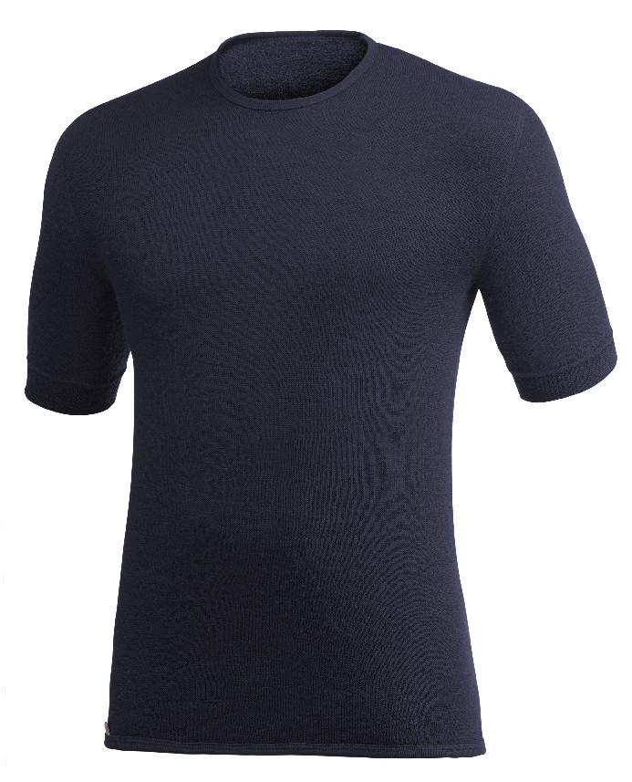 T-Shirt aus hochfeiner Merinowolle mit rundem Halsausschnitt, im Rundstrickverfahren ohne längsgerichtete Nähte gefertigt und mit elastischen Ärmelbündchen. Das Frotteematerial verfügt über hervorragende Isolationseigenschaften und wärmt auch im feuchten Zustand sowie bei extrem kalten Temperaturen ausgezeichnet.