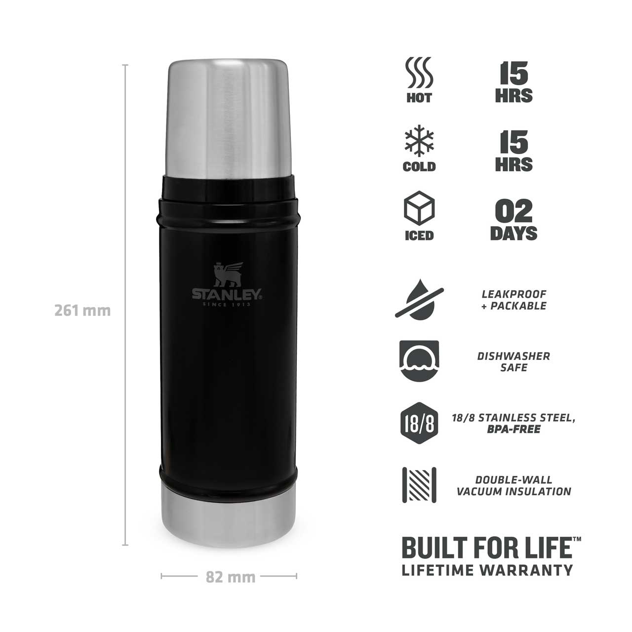 Ideal für das Picknick. In der Stanley CLASSIC VAKUUM-FLASCHE aus rostfreiem Edelstahl kann man sowohl warme als auch kalte Getränke mitnehmen. Eine Doppelwand gewährleistet eine gute Isolation und hält die Flüssigkeit bis zu 15 Stunden kalt oder 15 Stunden heiß. Die Flasche weist eine 5 cm weite Öffnung auf und lässt sich so leicht reinigen. Praktisch ist der isolierte Deckel mit Gefäßfunktion. Das Gehäuse ist mit einer robusten, matt schwarzen Lackierung versehen. Fassungsvermögen 0,47 Liter.