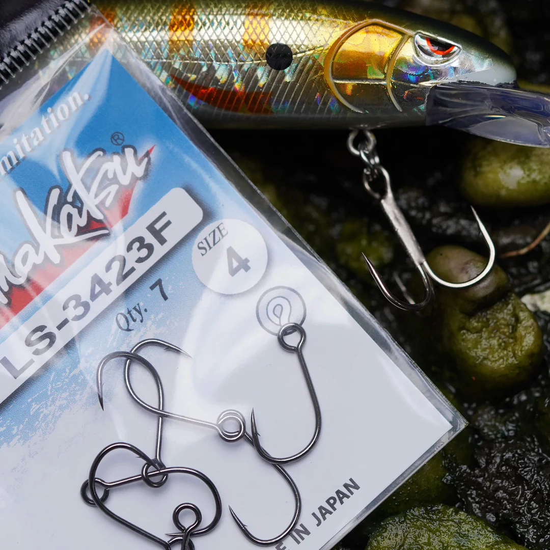 Der Gamakatsu LS-3423 Einzelhaken hat sein Öhr entlang der Hakenbiegung und eignet sich daher besonders gut zum Montieren von Wobblern mit Ösen quer zum Angelplatz, wenn der Haken über einen Sprengring verbunden ist. Durch die Verwendung eines zweiten Sprengrings kann dieser Haken auch an Wobblern mit gekreuzten Ösen montiert werden, ohne dass er aus der Reihe gerät.