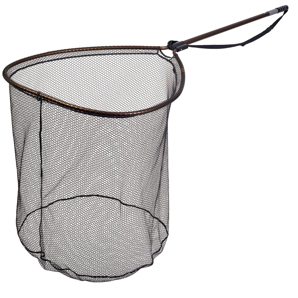 Birnenförmiges, besonders stabiles Netz mit festem Rahmen und bronzefarbener eloxierter Oberfläche. Gummigriff und integrierte Waage.