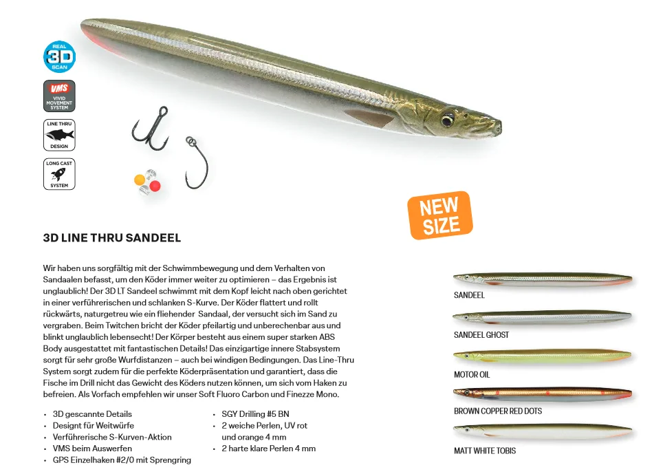 Savage Gear hat sich sorgfältig mit der Schwimmbewegung und dem Verhalten von Sandaalen befasst, um den Köder immer weiter zu optimieren – das Ergebnis ist unglaublich! Der 3D LT Sandeel schwimmt mit dem Kopf leicht nach oben gerichtet in einer verführerischen und schlanken S-Kurve. Der Köder flattert und rollt rückwärts, naturgetreu wie ein fliehender Sandaal, der versucht sich im Sand zu vergraben. Beim Twitchen bricht der Köder pfeilartig und unberechenbar aus und blinkt unglaublich lebensecht! Der Körper besteht aus einem super starken ABS Body ausgestattet mit fantastischen Details! Das einzigartige innere Stabsystem sorgt für sehr große Wurfdistanzen – auch bei windigen Bedingungen. Das Line-Thru System sorgt zudem für die perfekte Köderpräsentation und garantiert, dass die Fische im Drill nicht das Gewicht des Köders nutzen können, um sich vom Haken zu befreien. Als Vorfach empfehlen wir unser Soft Fluoro Carbon und Finezze Mono.