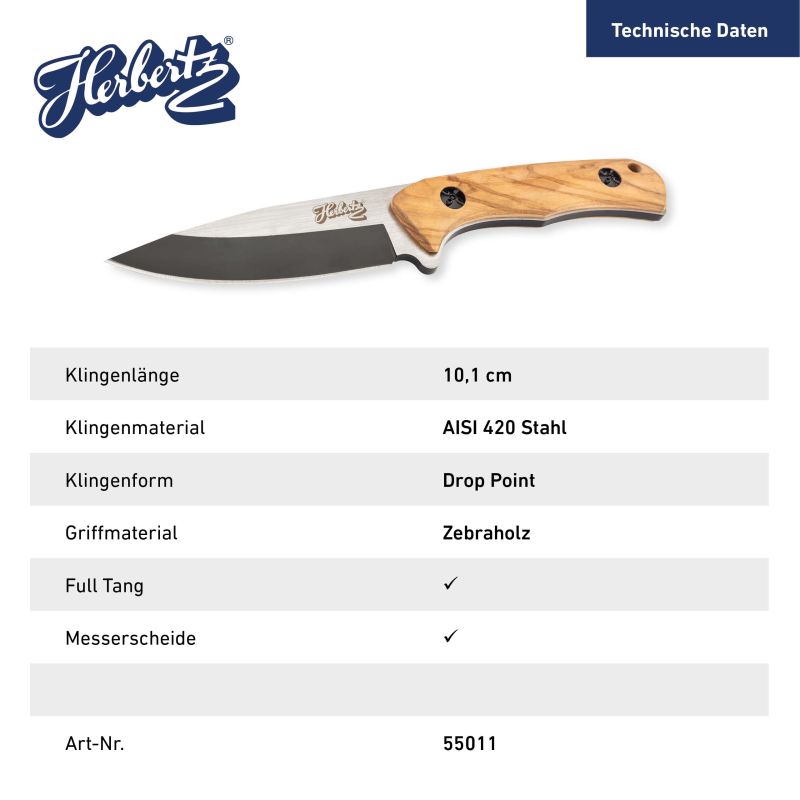 Herbertz Gürtelmesser, AISI 420 Stahl, rostfrei, Zebranoholz-Griff