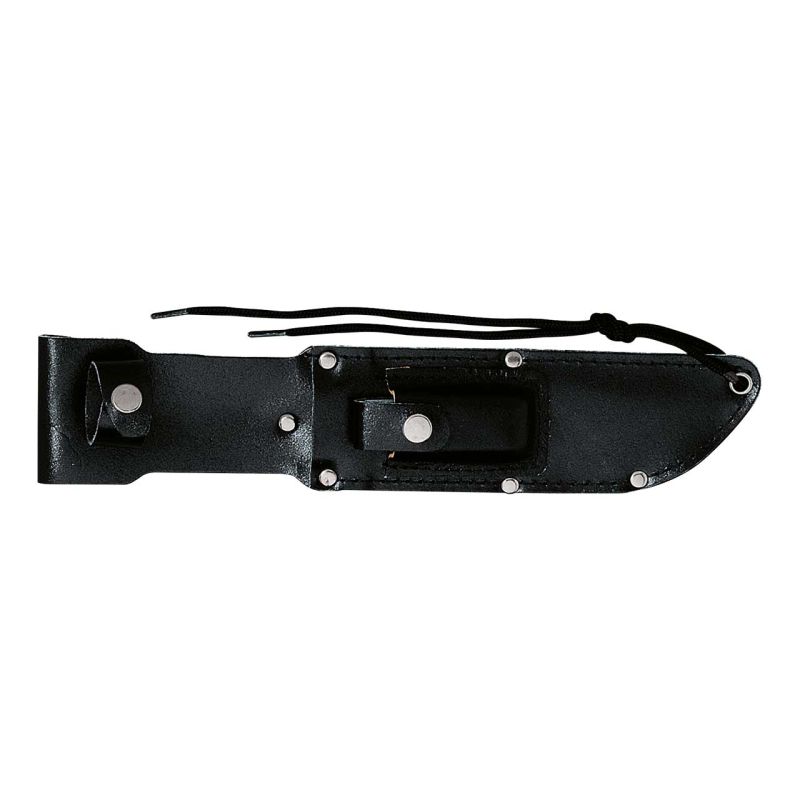 Wuchtiges Herbertz Bowie-Messer mit einer 18 cm langen, brünierten Klinge aus nicht rostfreien Carbonstahl S45C. Der Griff ist aus festem Leder gefertigt. Zur Klinge hin schließt sich ein Parierelement zum Schutz der Hand an. Das Messer wird in einer Lederscheide geliefert, in deren Vortasche sich ein Abziehstein befindet.