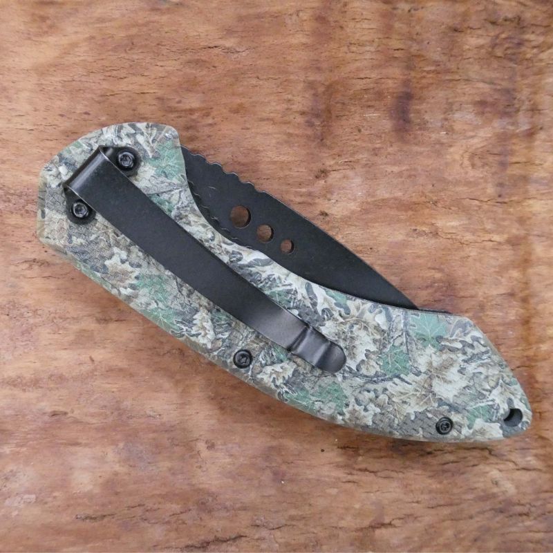 Dieses Taschenmesser aus der CJH Serie von Herbertz ist mit einer schwarz beschichteten Drop Point Klinge aus rostfreiem AISI 420 Stahl ausgestattet. Nach dem Öffnen der Klinge wird diese durch einen Liner Lock sicher in Arbeitsposition gehalten. Das im Wood Camo Design bedruckte Heft aus ABS Kunststoff mit Einlagen aus blauem Aluminium liegt durch den ergonomischen Griff sicher in der Hand. Eine Fangriemenöse und ein Tip Down Taschenclip vervollständigen die Ausstattung.