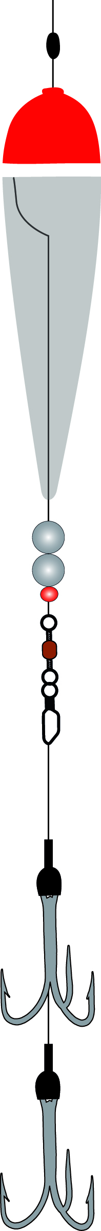 Ideal um Köderfische driftend anzubieten. Der Einzelhaken wird vom oberhalb des Kopfes herausgeführt. Drilling in den Rücken einstechen. So steht der Köderfisch waagerecht im Wasser und lässt inh wie einen schwimmende Beute erscheinen.