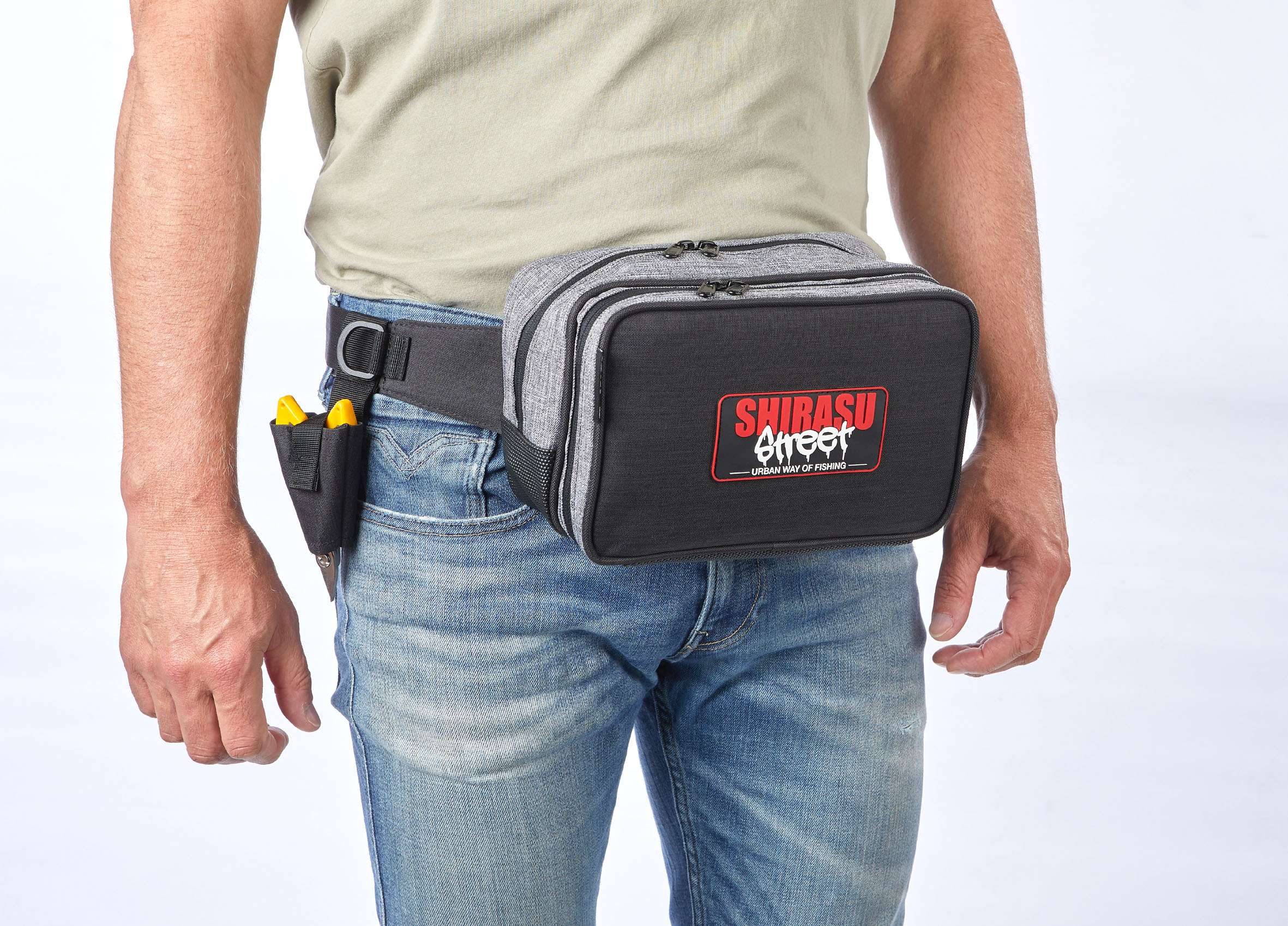 Shirasu Street Waist Bag/Bauchtasche: Sehr bequem zu tragende Bauchtasche. Analog zu unserem Sling Bag lässt sich auch das vordere Fach wie eine Laptop-Tasche öffnen. Dank der angebrachten Laschen bleibt das vordere Fach in einer horizontalen Position. Die Box ist mit Klettverschluss gegen ungewolltes Rausfallen gesichert. Am Bauchgurt ist ein Zangenhalter integriert.