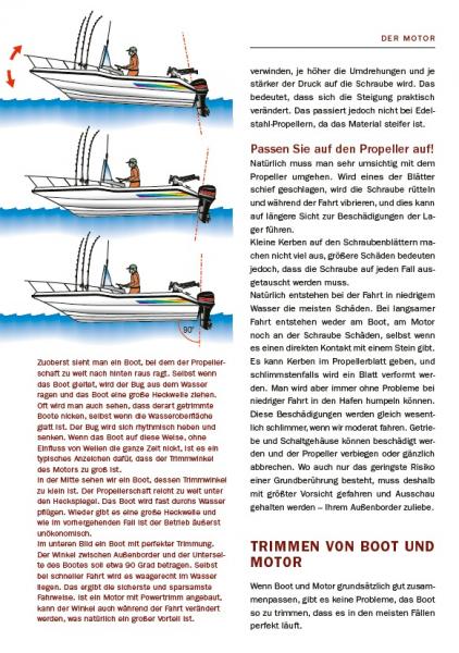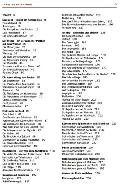 Der erste Teil des Buches beschäftigt sich mit dem Boot, Motor, Ausstattung, Sicherheit, etc., während es im Rest des Buches um die Fangmethoden geht, die sehr spezifisch für das Angeln vom Kleinboot sind.