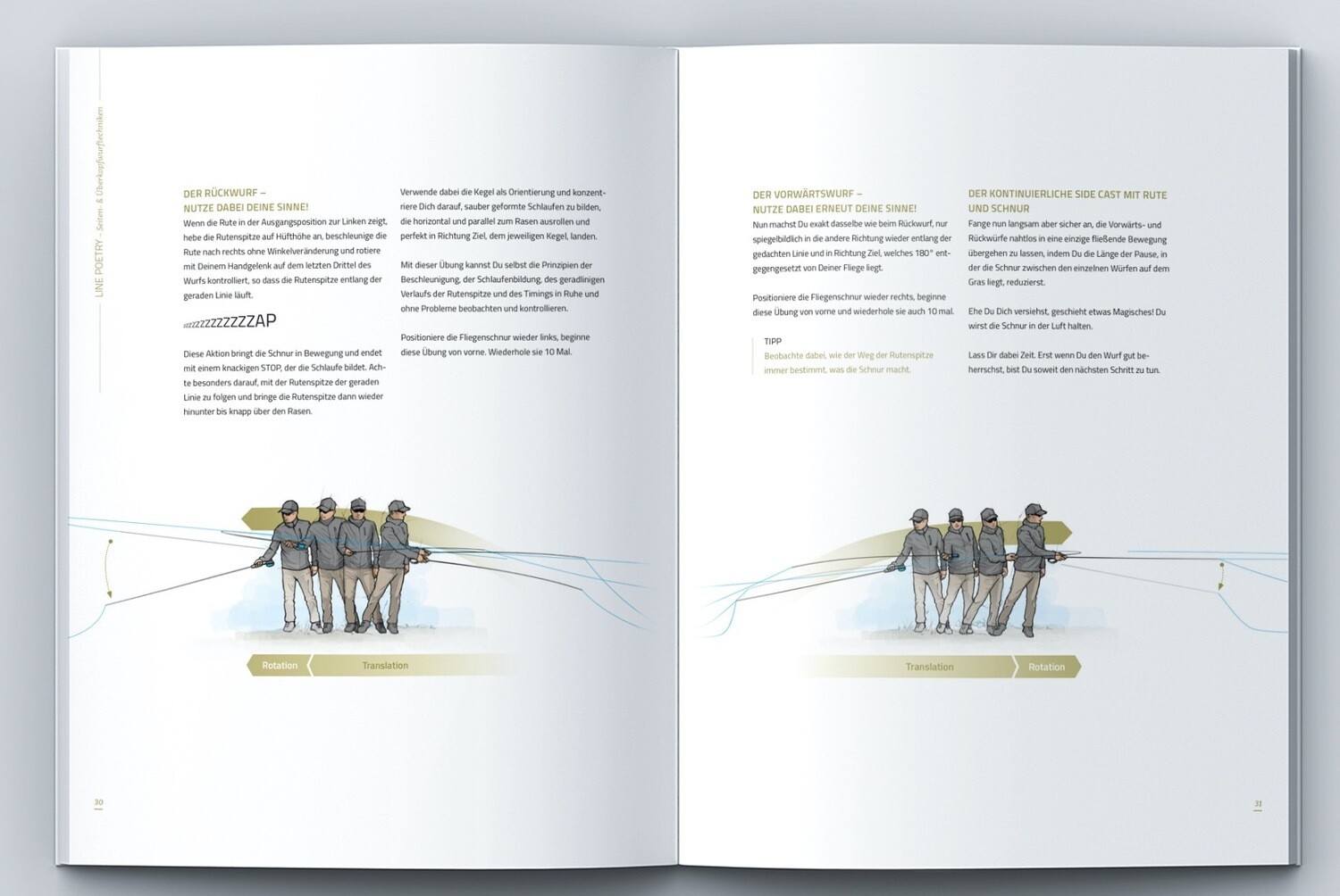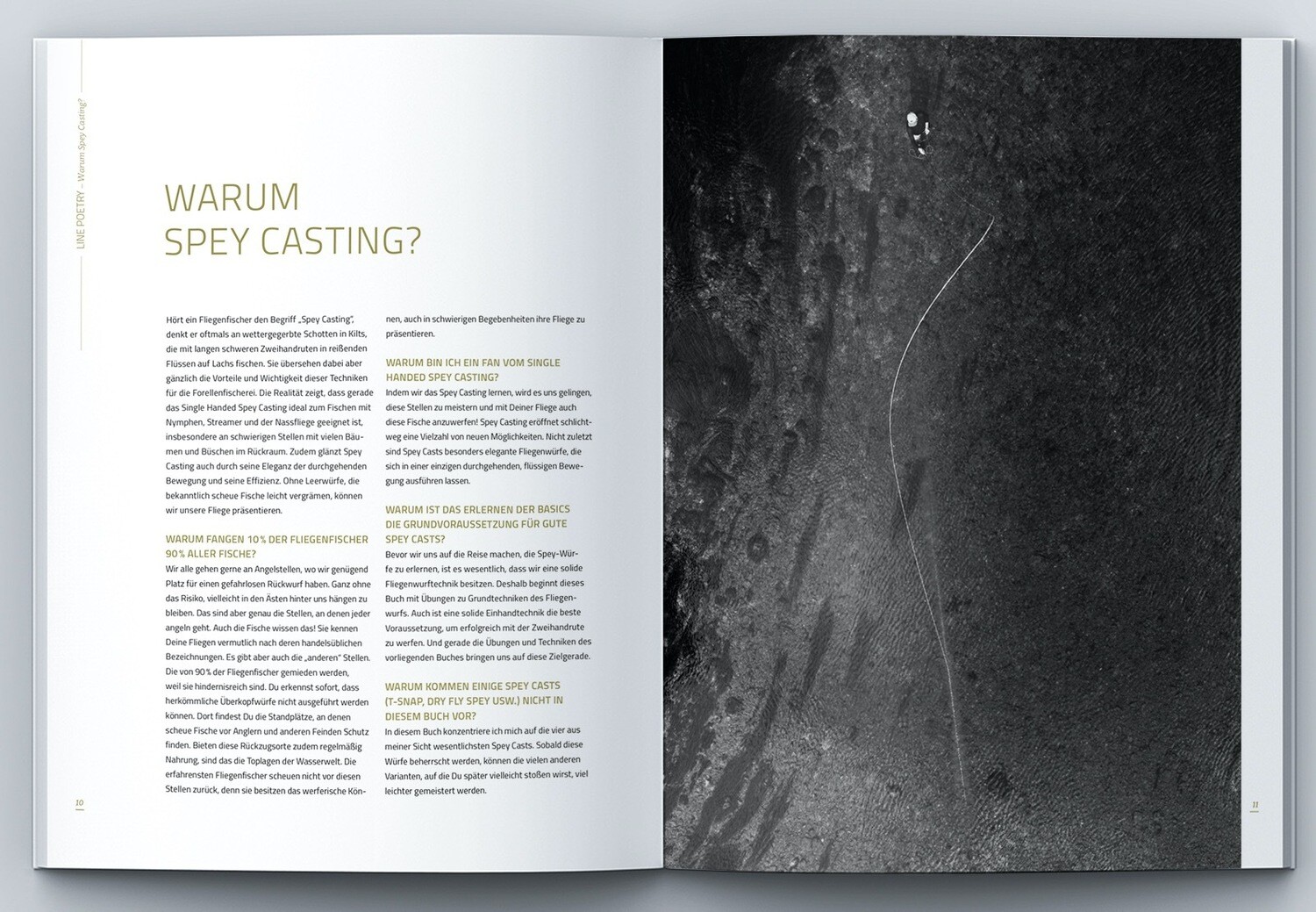 Line Poetry – Spey Casting mit der Einhandrute ist ein kunstvoll gestaltetes Lehrbuch über das Fliegenwerfen. Mittels Text, Fotografie und Illustration werden diese auf Wasserkontakt basierenden Würfe spielerisch und verständlich vorgestellt. Aufbauend auf praktischen Übungstipps für das Erlernen grundlegender Wurfschritte für einen kontrollierten und geübten Wurf von Roll Cast und Switch Cast, gipfelt das Buch in der detaillierten Beschreibung aller wesentlichen Spey Casts.