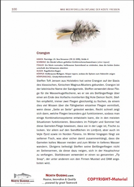 Er berichtet systematisch über die verschiedenen Futtertiere und die passenden Fliegenimitationen. Die Schilderungen sind unglaublich spannend und informativ. Denn immer wird das Beutetier an den Fressgewohnheiten der Meerforelle gespiegelt. Hier erhält der Leser und Meerforellenangler bisher nicht gekannte Einblicke. Dieses Hintergrundwissen war bisher nur wenigen Anglern zugänglich und wird im deutschsprachigen Raum zu ganz neuen Einblicken führen.